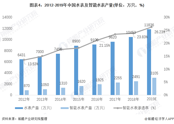在國家政策和技術(shù)的促進下,及依托智能水表在智慧水務(wù)發(fā)展背景下的獨特的優(yōu)勢,我國智能水表的滲透率和產(chǎn)量不斷增加。2012年我國水表產(chǎn)量為6431萬只,智能水表產(chǎn)量僅為870萬只,智能水表的滲透率僅為13.53%,不足15%。據(jù)統(tǒng)計,至2018年我國智能水表產(chǎn)量超過2400萬只,市場滲透率達到23.83%,預(yù)計2019年我國智能水表產(chǎn)量超過3000萬只,市場滲透率進一步提升,將超過26%。